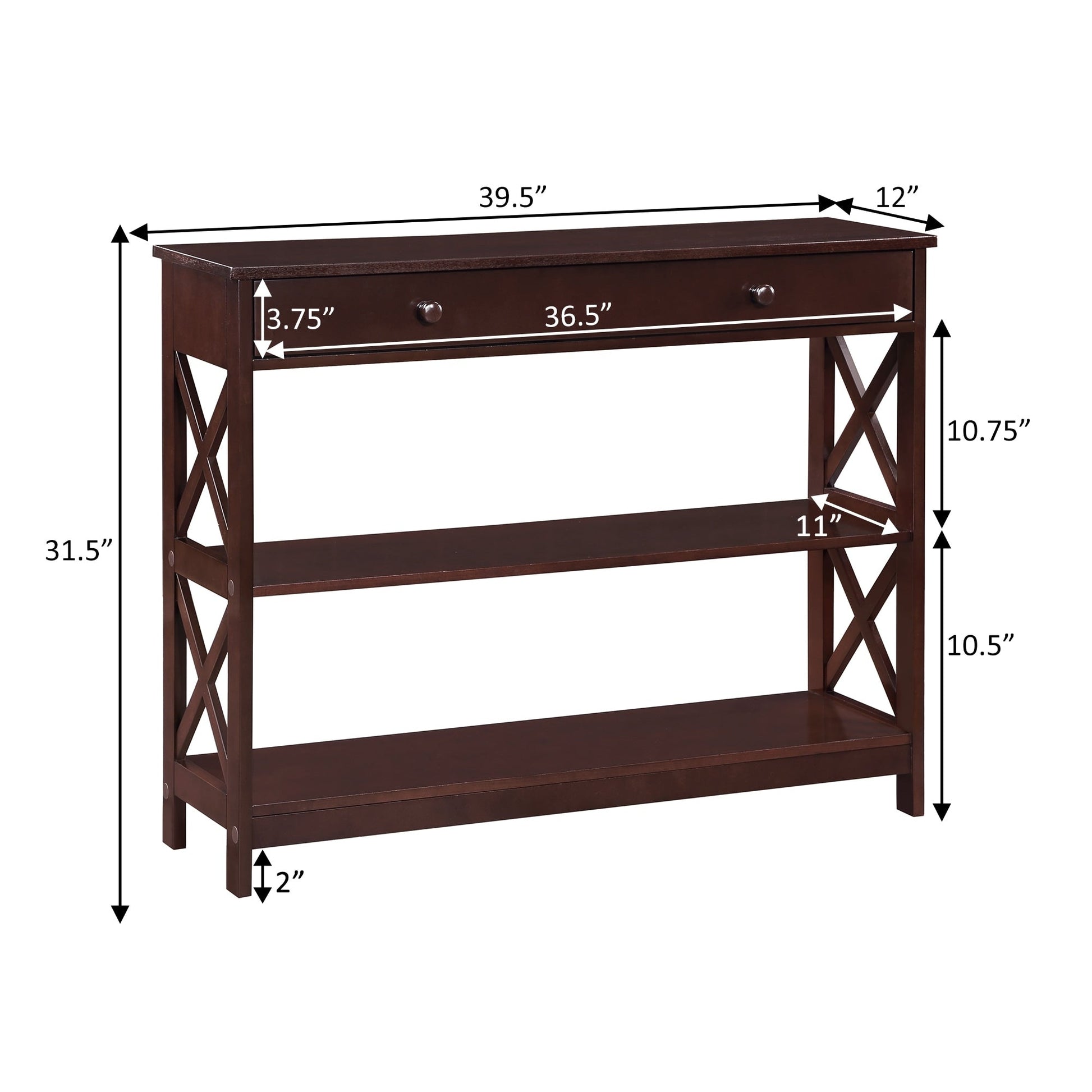 Make your home truly timeless with the Oxford 1 Drawer Console Table with Shelves by Convenience Concepts. This transitional piece features a pull-out drawer on smooth roller slides with two stylish drawer knobs for easy accessibility. The spacious drawer offers plenty of room to stow away entryway essentials and everyday necessities. The X-frame side panels and the three tiers of shelving make this console the perfect decorative piece to display in any room of your home. Beautifully crafted from MDF, non-lead-based paint, and particleboard, this unit is sure to last. Add coordinating pieces to your home from the Oxford Collection by Convenience Concepts, each sold separately.