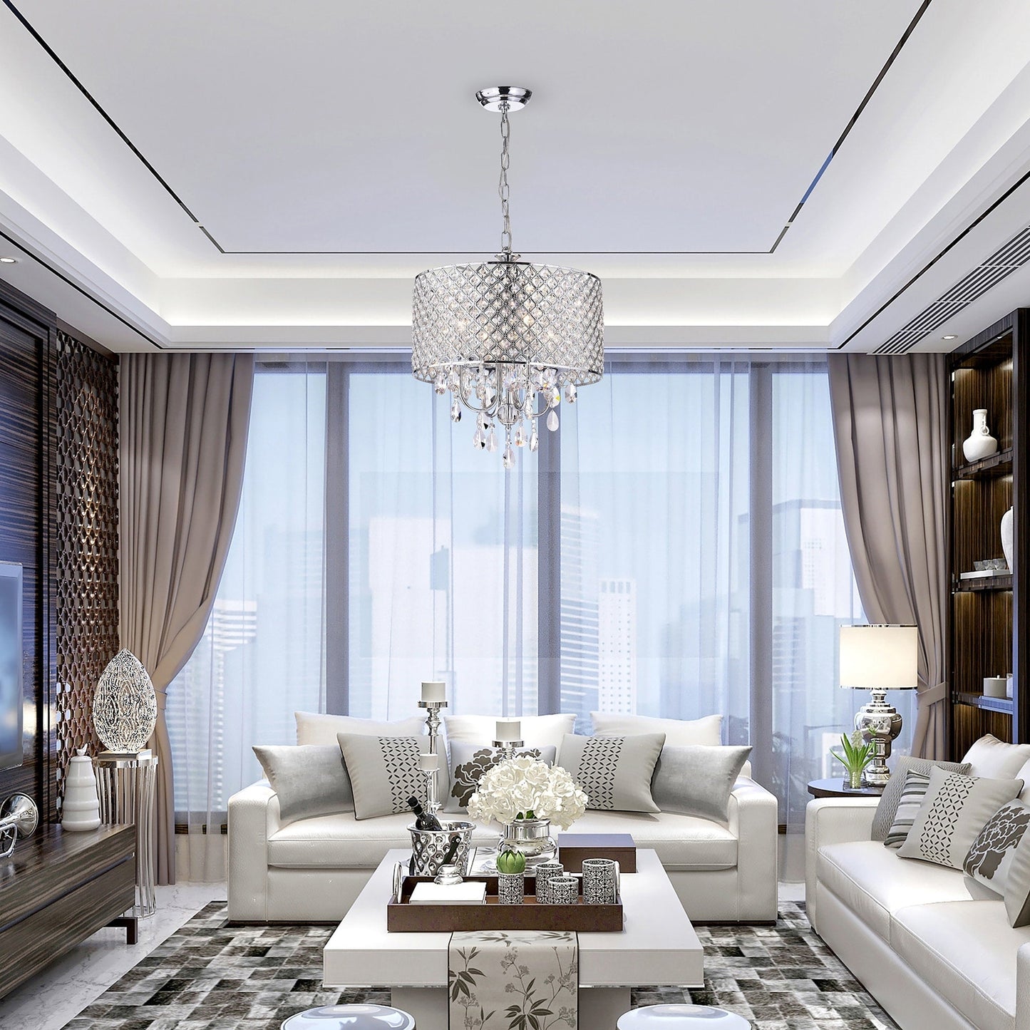 • 4-light chandelier: 17 in. Dia x 20 in. H with crystal hanging, Drum Dimensions: 17 in. Dia x 8.75 in. H
