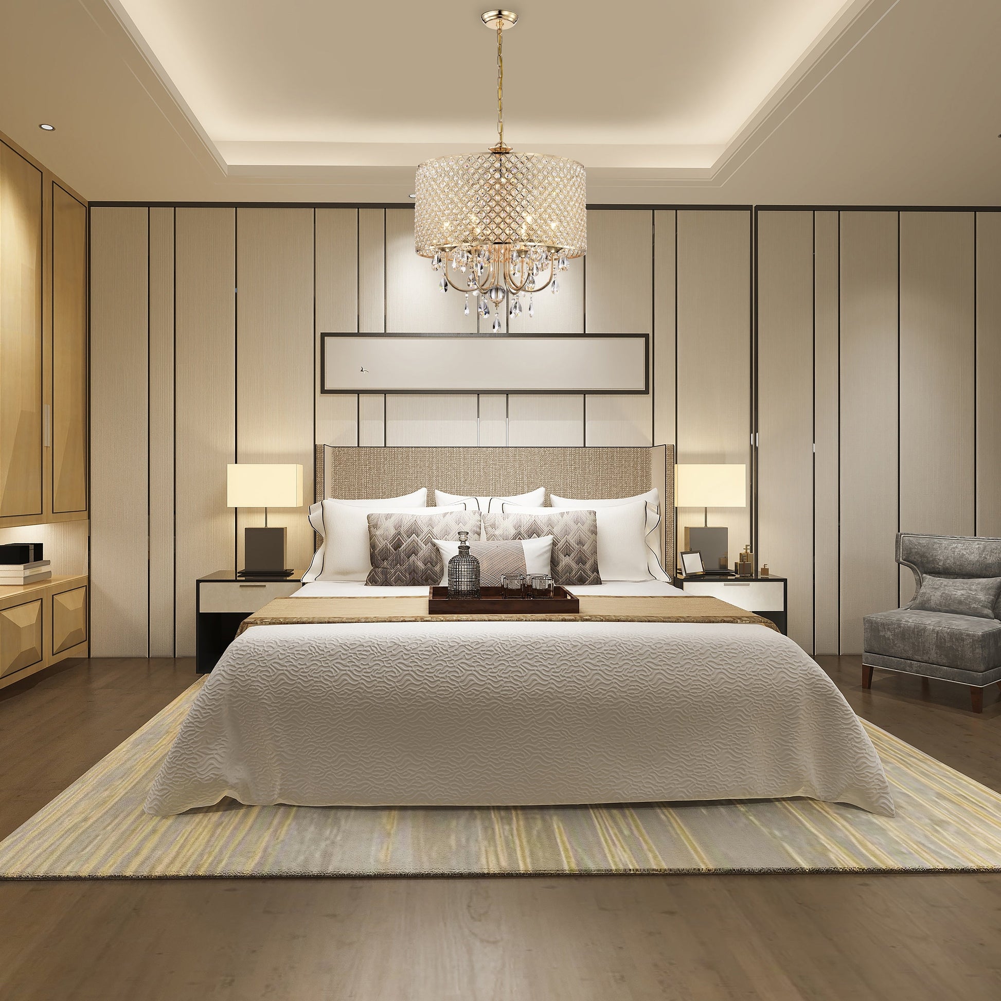 • 6-light chandelier: 22 in. Dia x 24 in. H with crystal hanging, Drum Dimensions: 22 in. Dia x 11 in. H