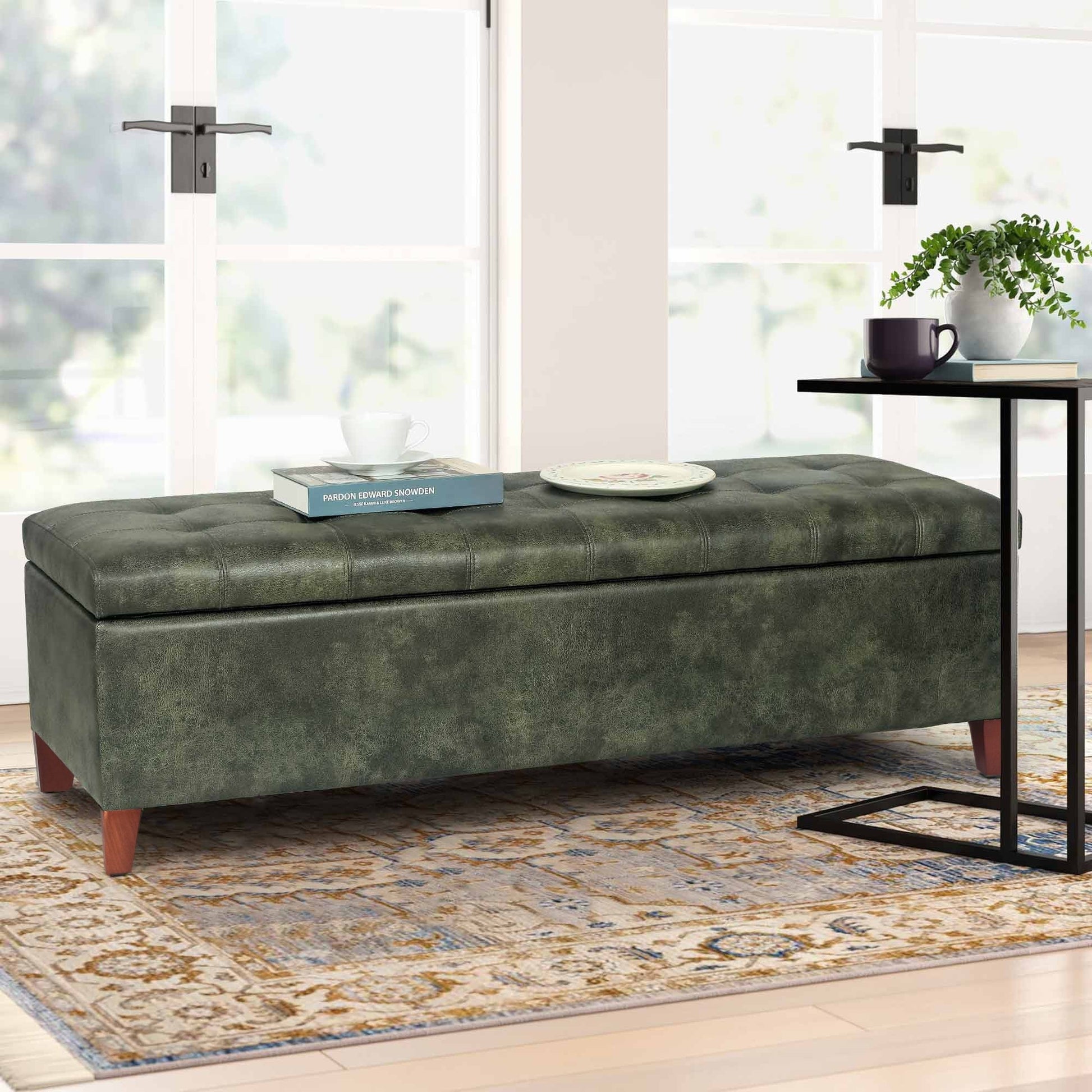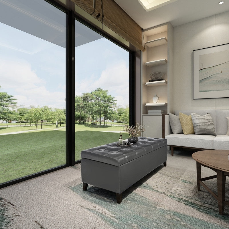 Add sophistication and storage to your space with this storage ottoman bench. This elegant piece, available in many colors, features button-tufted cushioning for comfortable seating and a large interior storage space perfect for blankets, books, or other household items. The raised design adds character to your bedroom or entryway, while the durable bonded leather ensures long-lasting quality.